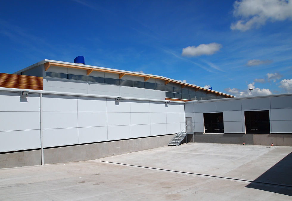 The conference rooms, with their fully glazed external walls, are shaded by means of powder coated aluminium ‘brise soleils’ to reduce solar gain on the South and West elevations. The studio space is heated by underfloor heating coils powered by roof mounted air source heat pumps.